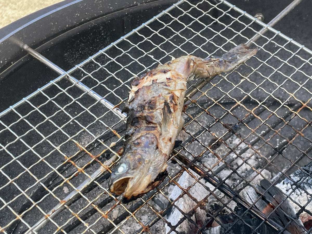 ニジマスの塩焼きが炭火で香ばしく焼かれる様子も日本酒のアテになります